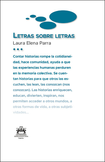 Letras sobre letras corresponde al número 1 de una serie de cuadernillos preparada en el seno del Taller de periodismo opinativo dependiente del Centro de Difusión Cultural de la Universidad Iberoamericana Torreón. Los textos —artículos, reseñas bibliográficas y algunas crónicas— han sido en su mayoría parte de las colaboraciones que alimentan las columnas periodísticas que la Ibero Torreón sostiene semanalmente en los diarios El Siglo de Torreón y Milenio Laguna. Se trata, por ello, de aportaciones breves en las cuales, como es posible advertir en las propuestas de Laura Elena Parra, se reflexiona sobre temas de interés general con un ánimo divulgativo. Señala la autora: “En Letras sobre letras hay reseñas de novelas, ensayos, cuentos, así como de libros basados en hechos históricos y en investigaciones. Se presentan en el orden cronológico de su publicación. En cada una de las reseñas se plantea, además, una semblanza del autor. La intención de Letras sobre letras es promover la lectura a través de la reseña de libros e invitar al cultivo de la lectura, uno de los mejores hábitos que podemos tener para aprender, entretenernos, reflexionar y soñar”.